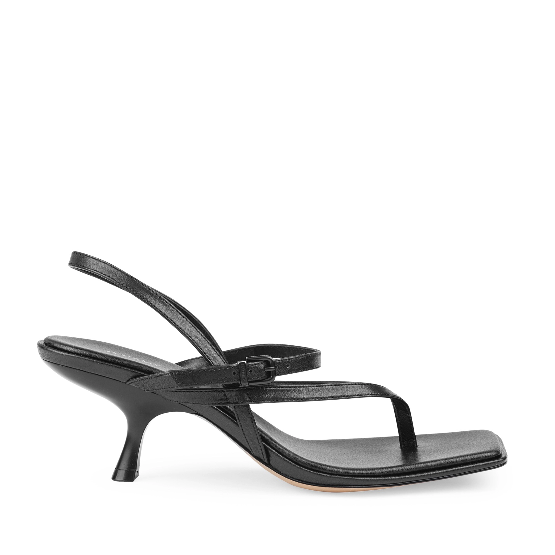 Over-the-toe shoes are one of the hottest shoe trends. We visualized it in minimalist black natural leather sandals with a square tip and a comfortable low heel. Accents of the model are thin straps that intertwine and a buckle in a contrasting gold tone.