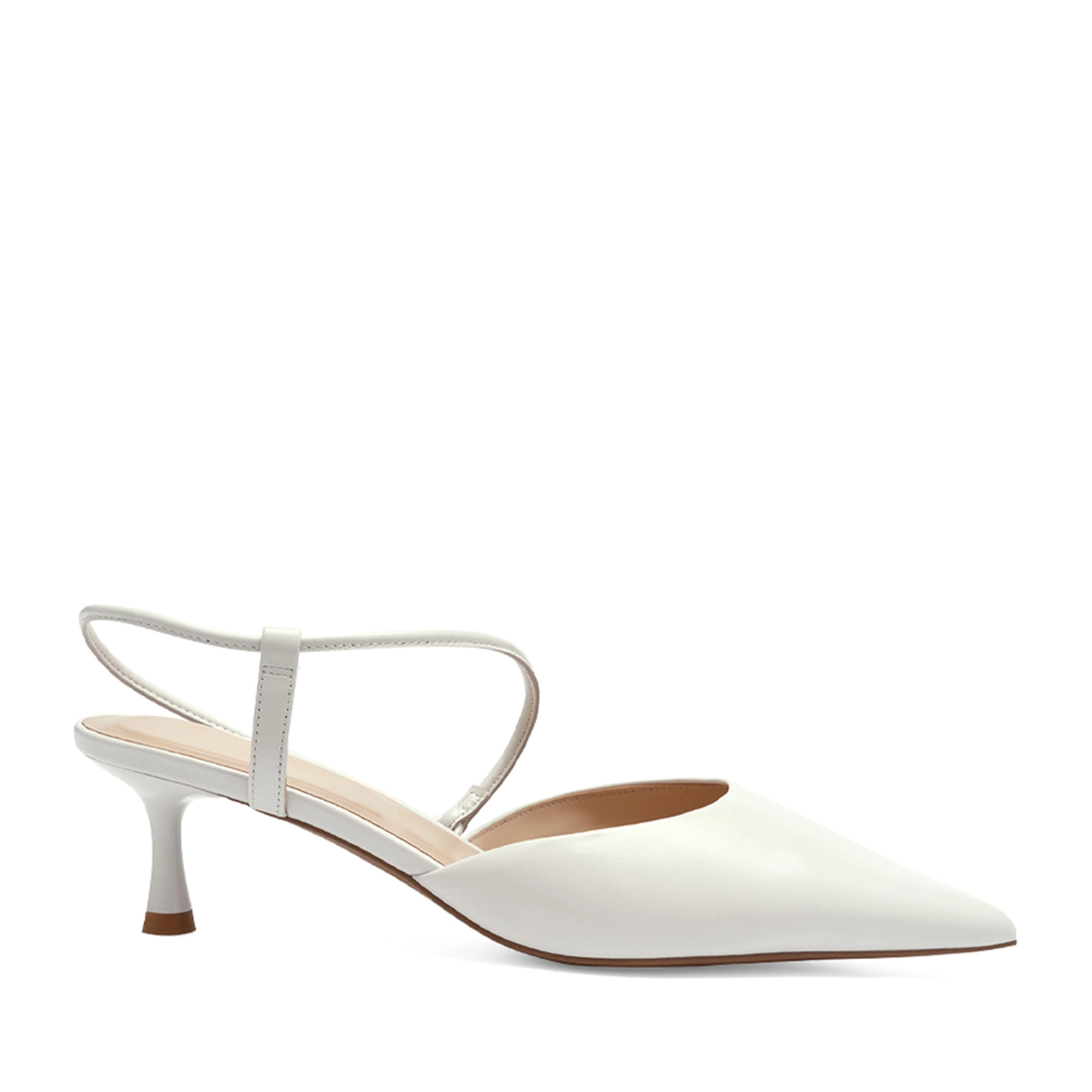 This model combines the graceful style of the slingback shoes and the trendy kitten heel. A special feature of this pair is the absence of a clasp. The shape of the soft and thin strap is anatomically designed to securely fix the foot. The model includes additional heels. A soft insole and natural leather are traditionally responsible for comfort. Minimalist design, the nude color and the classic pointy tip give the model great stylistic potential.