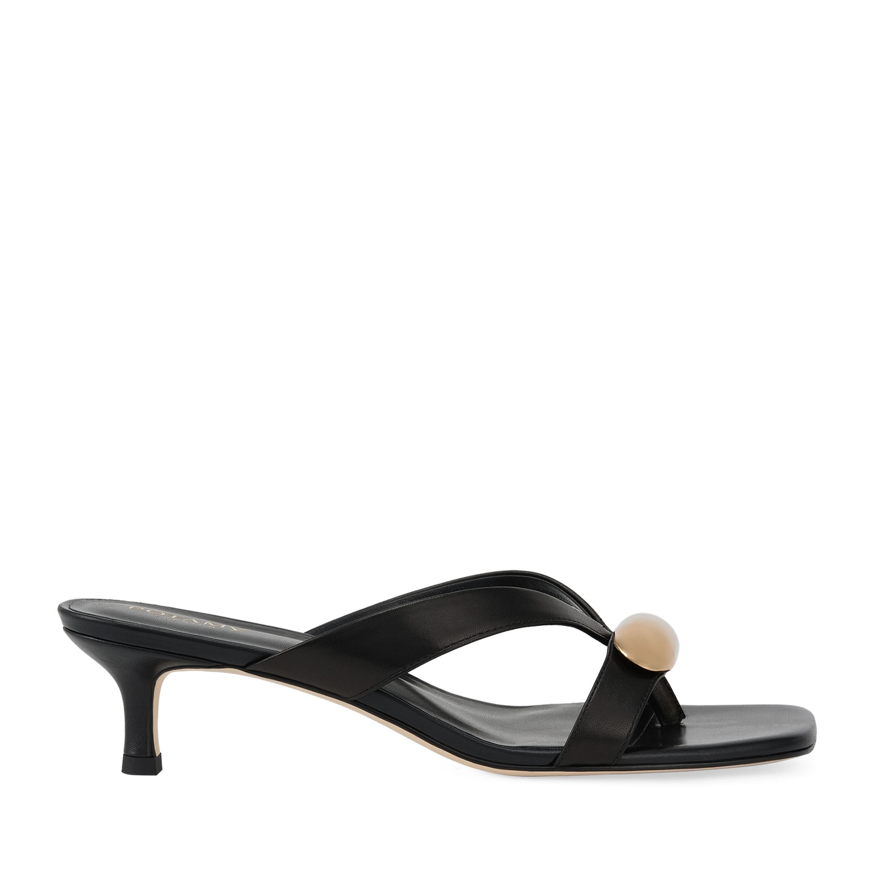 POTAMY PREMIUM Mules, where the main emphasis falls on details. The central element is a large metal detail in a gold shade. It creates an expressive contrast with the texture of black natural leather. Thin lines make the design trendy, and a soft strap fixes the model on the foot. The model have a stable kitten heel. Mules will fit into evening looks and city combinations that require a special addition.