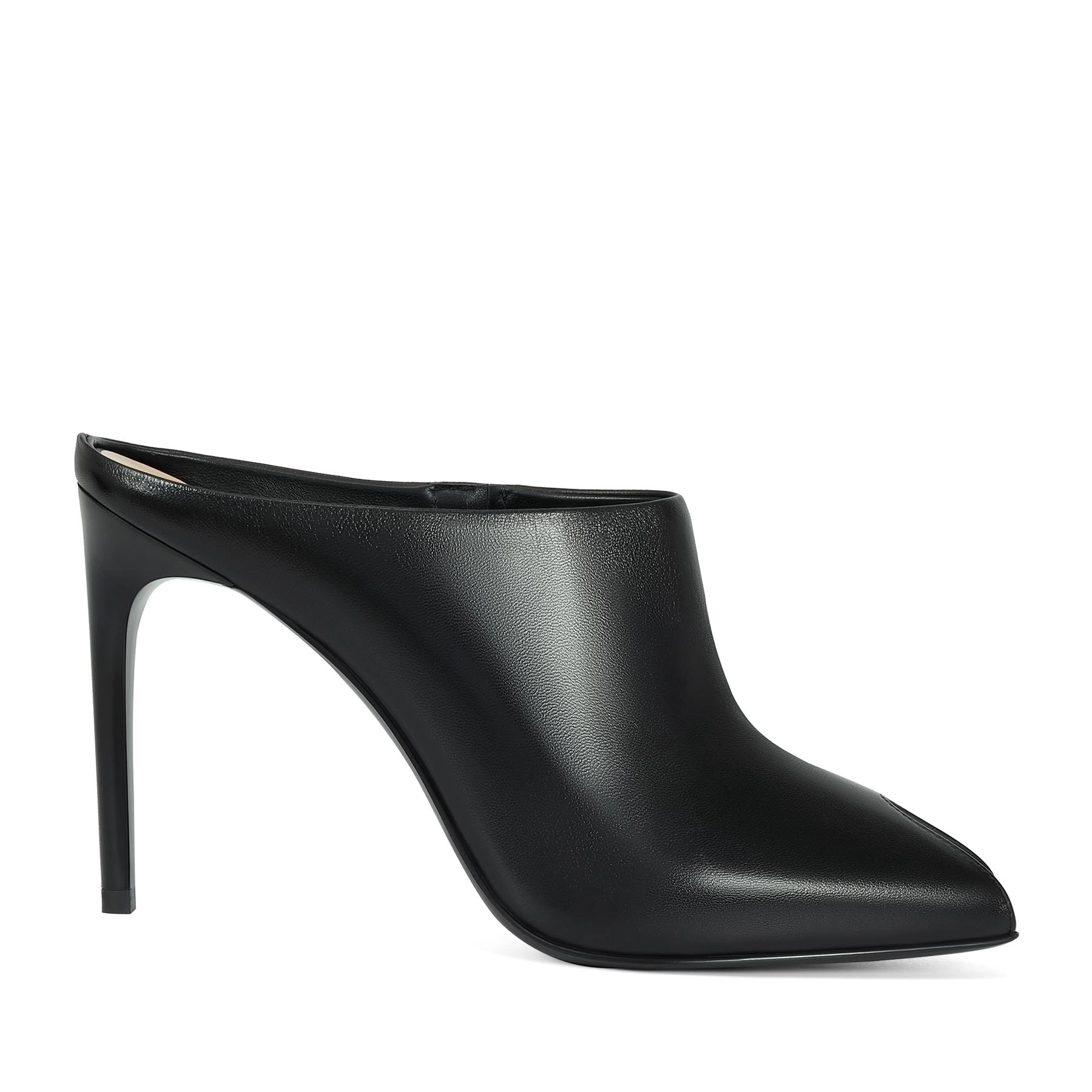 Smooth black leather mules are a simple touch for minimalist looks. The extended toe and thin heel with bicomponent resistant heel caps create a sophisticated silhouette, while the lack of fastenings makes them comfortable for everyday wear.