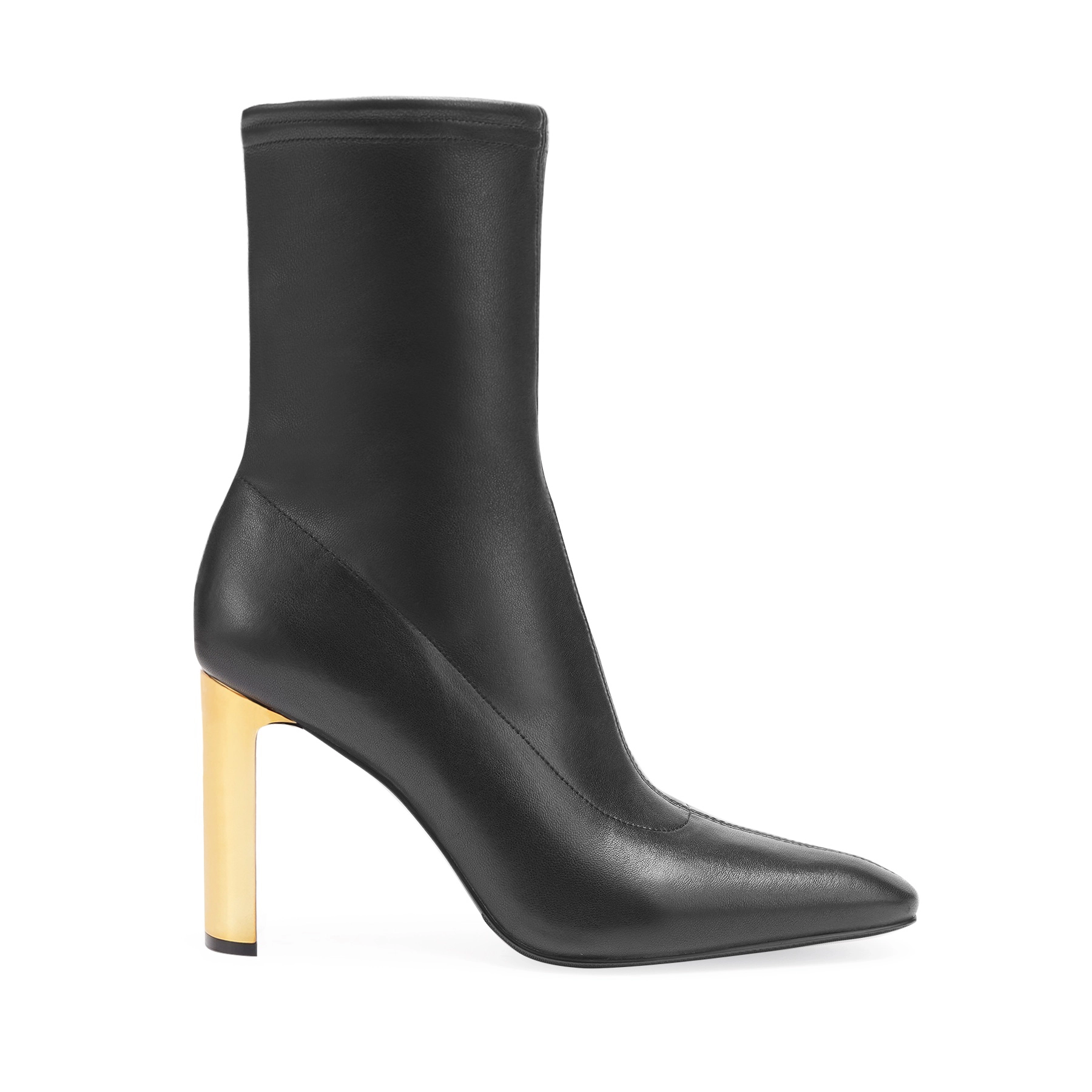 Botine - remarcabile din colecția POTAMY PREMIUM, în care centrul de atracție este tocul înalt. Echipa de designeri a creat-o într-un ton auriu metalic, contrastând cu culoarea neagră a pielii naturale. Materialul elastic se mulează confortabil pe picior și face silueta deosebit de elegantă.