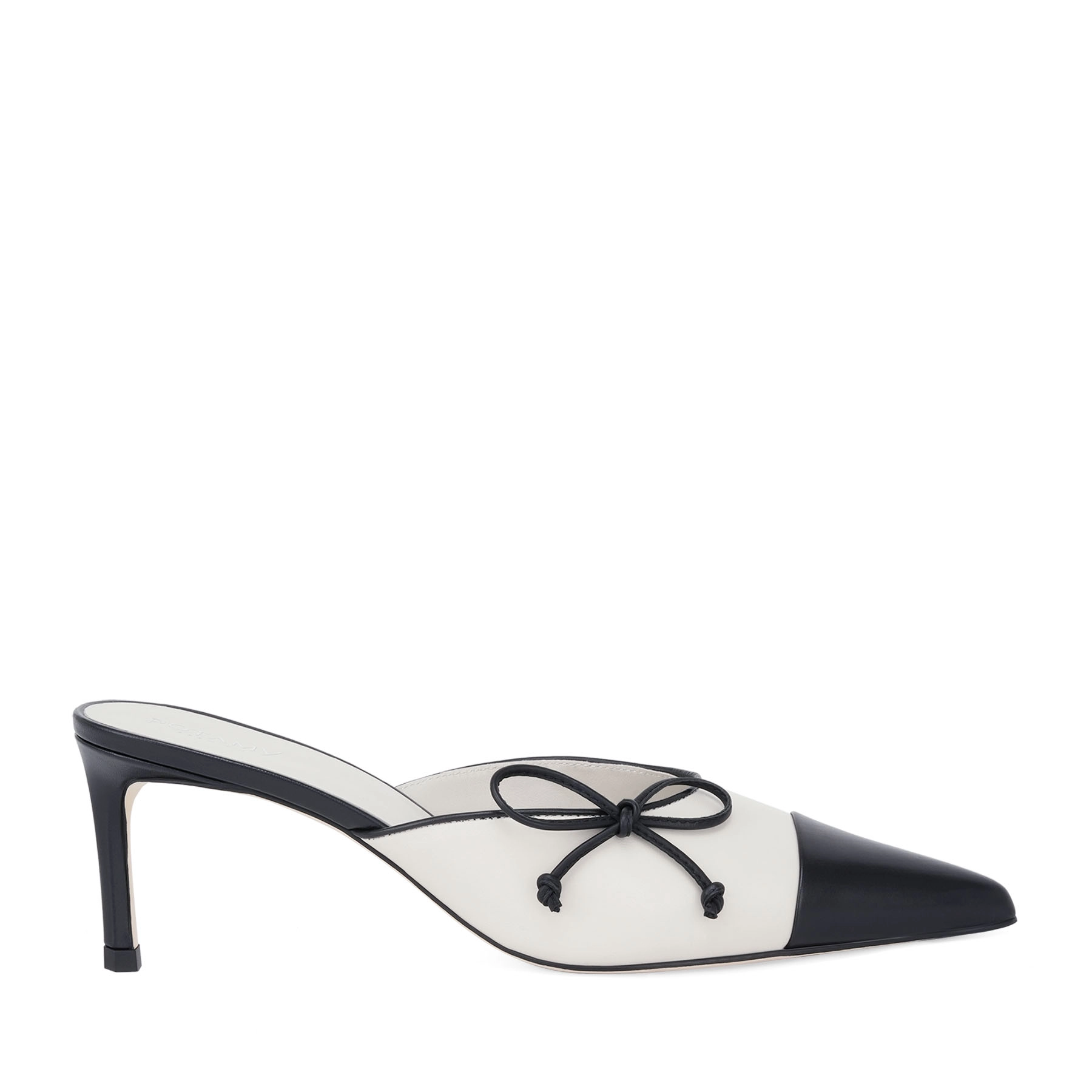 Pantofii mules POTAMY PREMIUM într-o interpretare deosebit de elegantă. Accentul principal în design este contrastul de culoare dintre alb și negru. Culoarea vârfului decupat se potrivește cu culoarea tocului și cu fundiță accentuată. Modelul este confortabil datorită tocului său de înălțime moderată și a designului bine gândit.