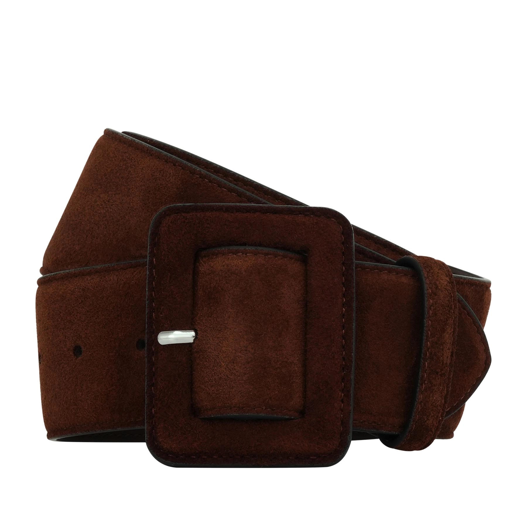 Curea lată și catifelată din velur este o piesă vestimentară remarcabilă care accentuează talia și adaugă textură. Catarama de culoarea nichelului și nuanța intensă de nuc creează un aspect izbitor, dar discret.
