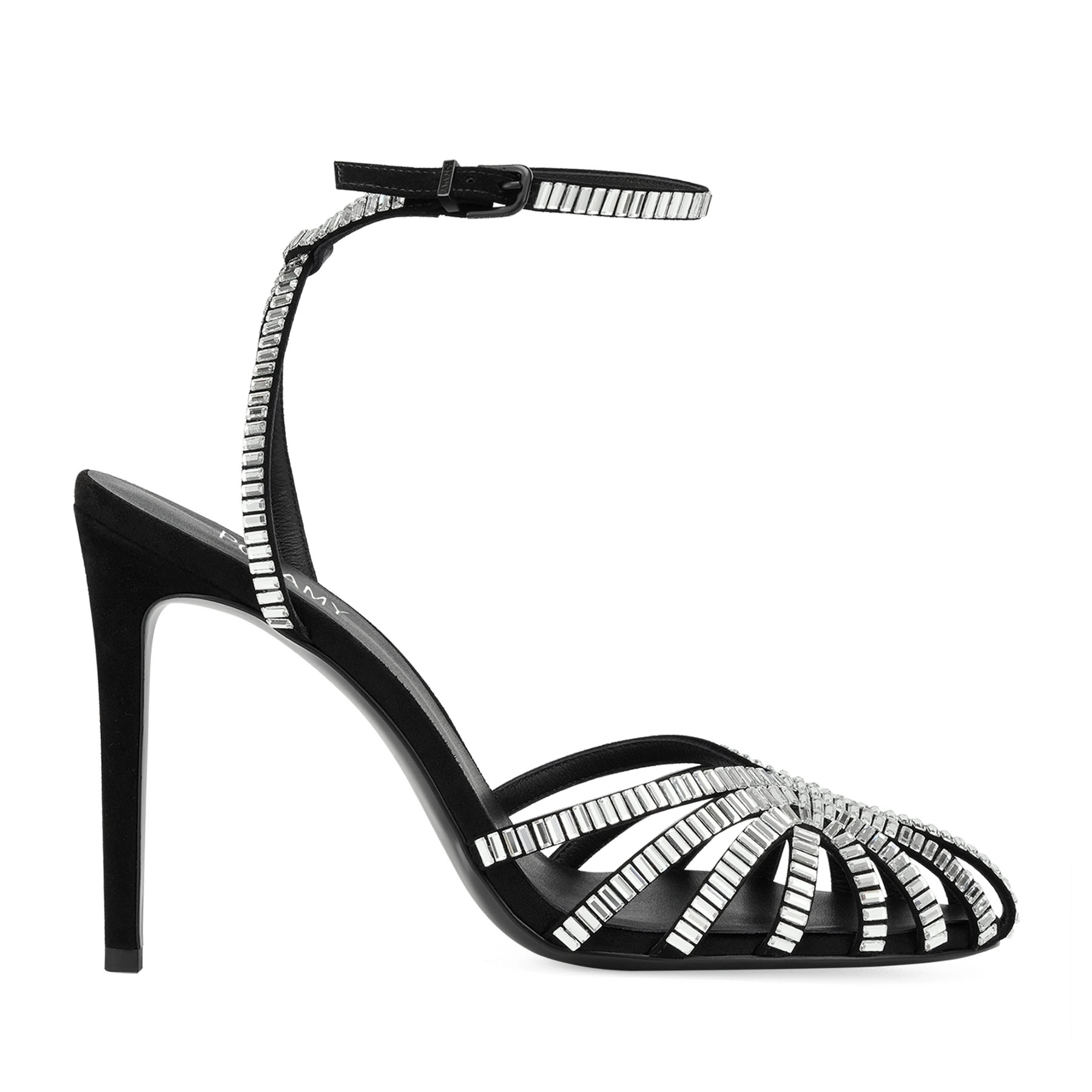 Sandale negre sunt o piesă clasică de seară, cu o abordare nouă. Strasurile strălucitoare de pe baza materialului creează un joc de lumini la fiecare mișcare, în timp ce tocul subțire cu flecuri bicomponente rezistente la abraziune, adaugă o notă delicată.